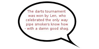 In the event, Messrs Hislop and Merton treated us relatively kindly, and there were pictures of select members. Speaking of members, the Chairman's final words were '...the darts tournament was won by Len, who celebrated the only way pipesmokers know how- with a damned good shag.'