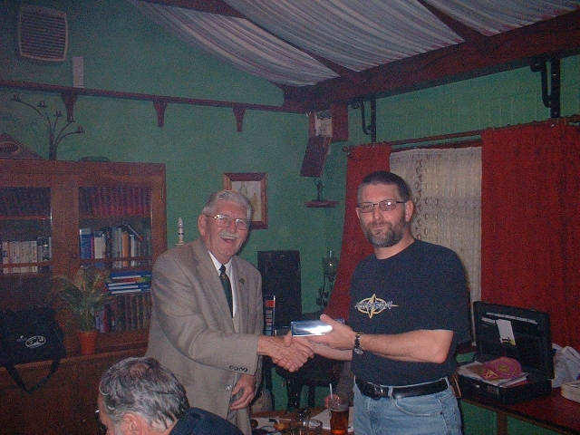 | Runner-up Len Ellis receives a tin of tobacco from PCN secretary, Keith Garrard |